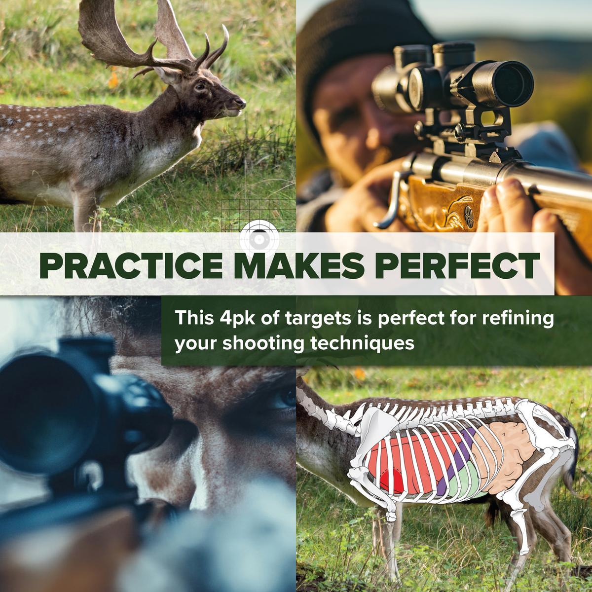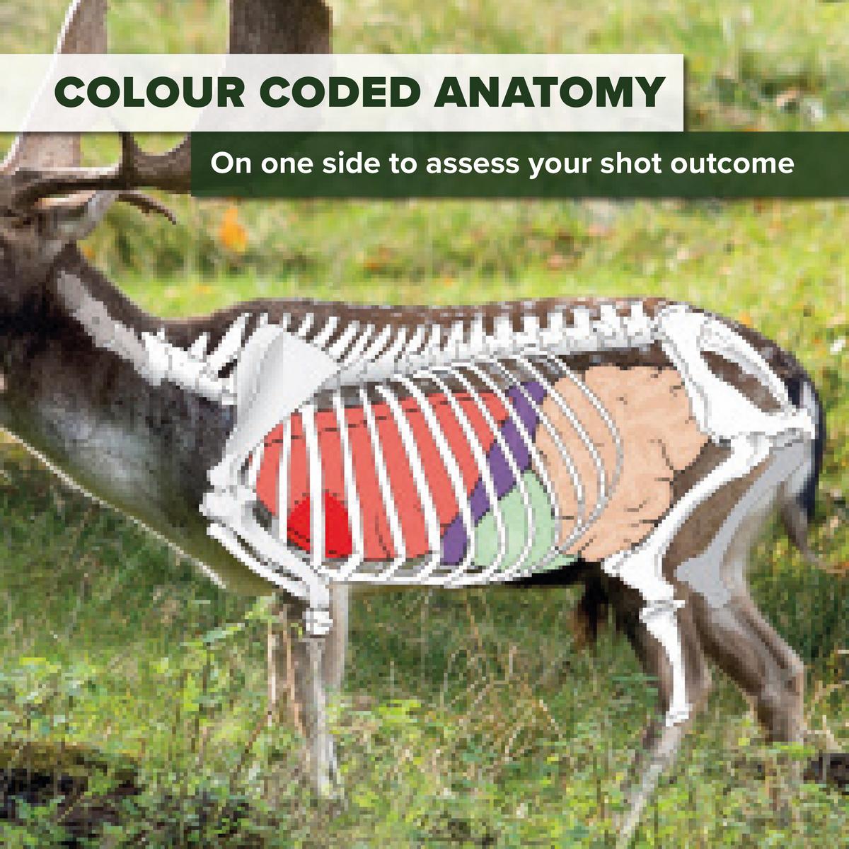 The reverse side of each target offers a highly detailed anatomical overlay, allowing shooters to study vital zones, organ placement, and shot accuracy in a training environment. Whether you're preparing for stalking season or improving your marksmanship, this dual-sided target is an effective tool for sharpening your skills.