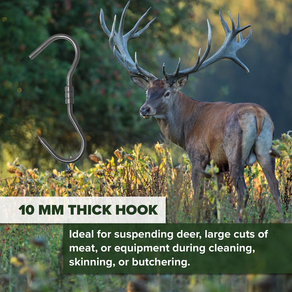The BushWear 10 mm Swivel Stainless Steel S-Hook is a heavy-duty hanging solution designed for hunters, butchers, and field processors who need reliable gear for game handling and meat processing. With a robust 10 mm thickness this hook is ideal for suspending deer, large cuts of meat, or equipment during cleaning, skinning, or butchering.