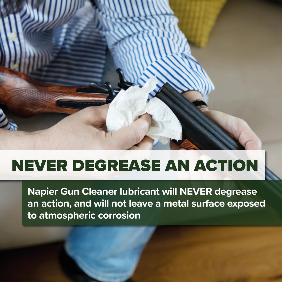 The Napier Gun Cleaner removes carbon, powder residue, and dirt without stripping vital lubrication from internal parts. Follow up with the Napier Gun Oil, which provides long-lasting protection from moisture and corrosion—even in challenging weather conditions.