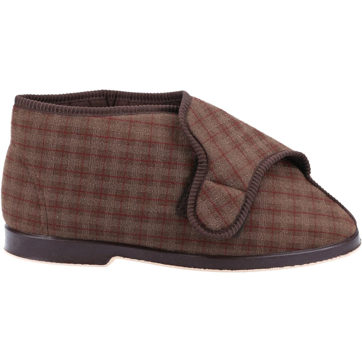 Super cosy easy touch-fasten mens slipper bootees from Great British Slippers. The classic tartan print uppers open almost down to the toe for easy entry and simply touch fasten. An adjustable design to accommodate for swelling.