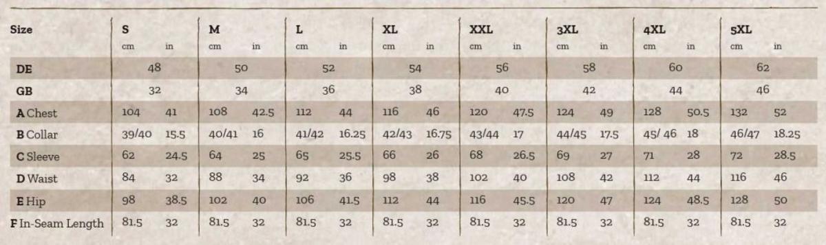 | Chest (inches/cm) | 36/92 | 38/96 | 40/100 | 42/104 | 44/108 | 46/112 | 48/116 | 50/120 | 52/124 | 54/128 |