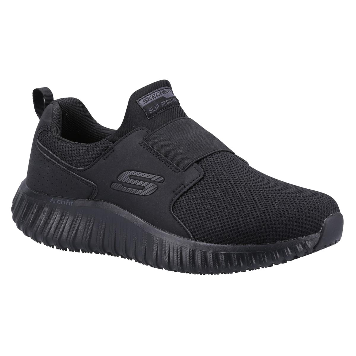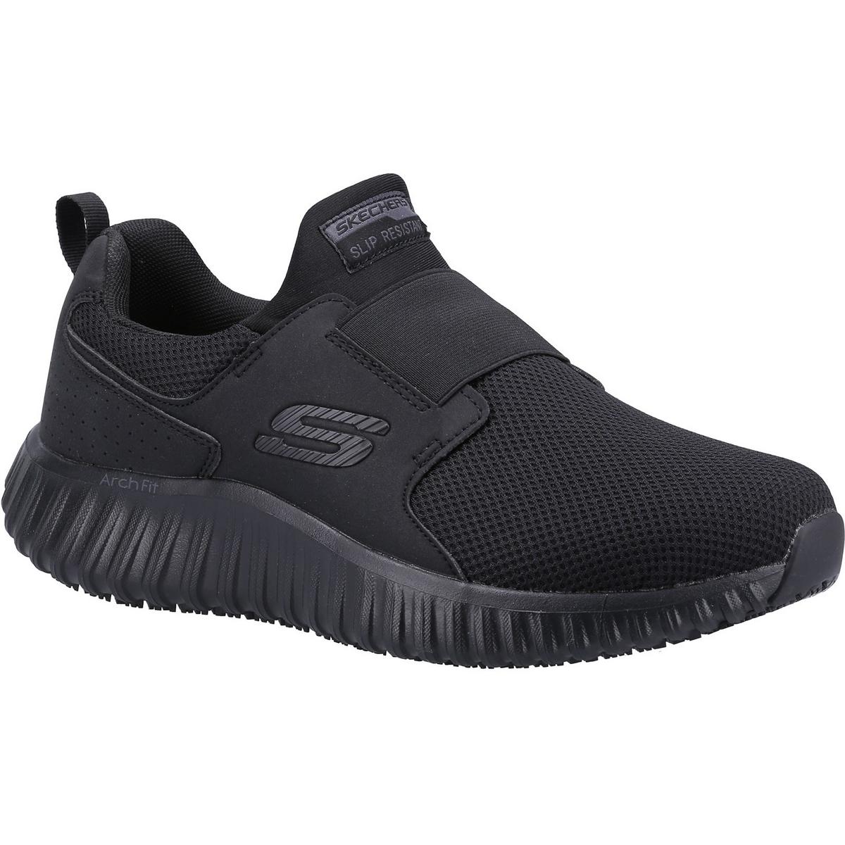 The Skechers Work: Arch Fit SR - Cicades shoe provides all-day support and comfort. This slip-resistant slip-on sneaker features a durable mesh and synthetic upper with removable Arch Fit supportive cushioning insole.