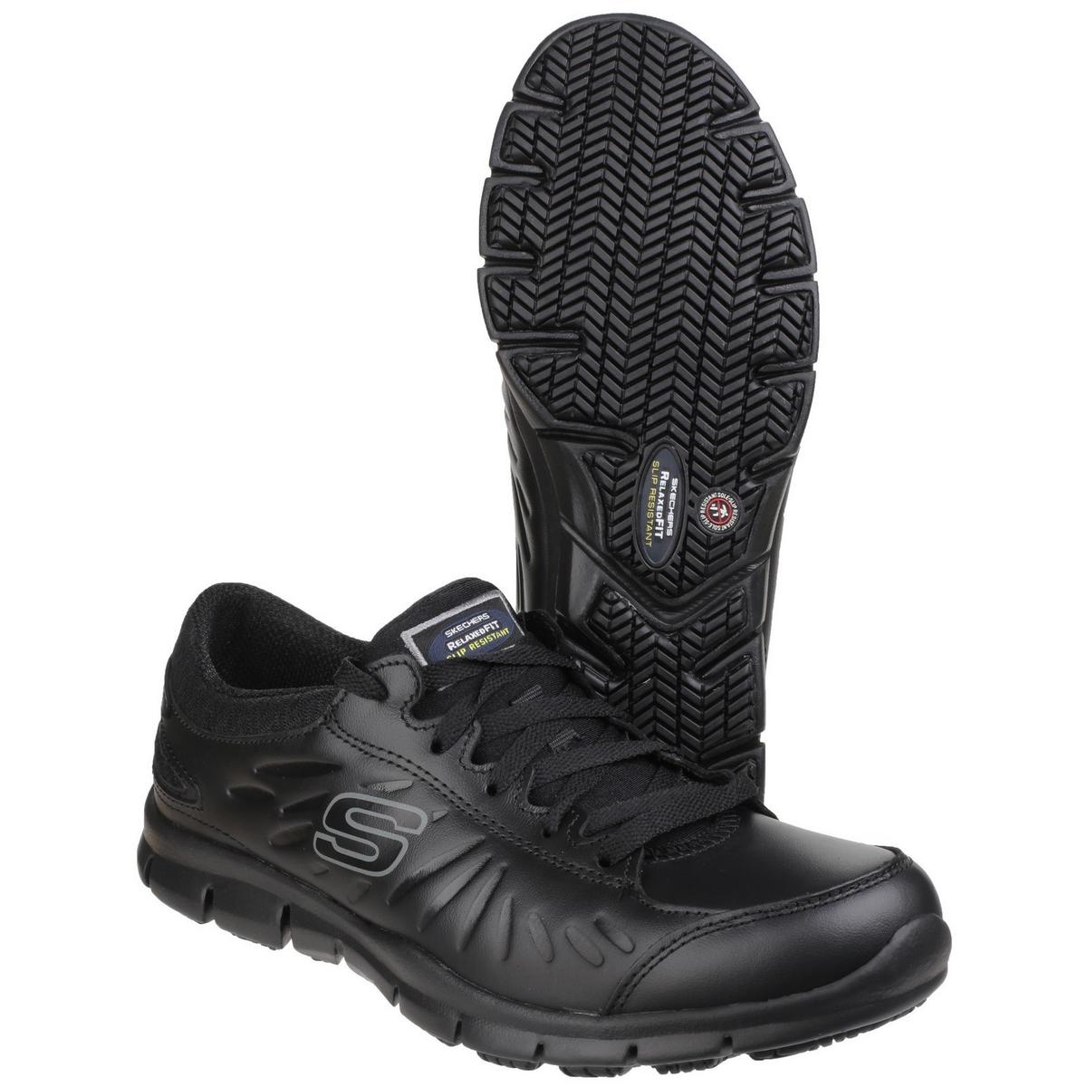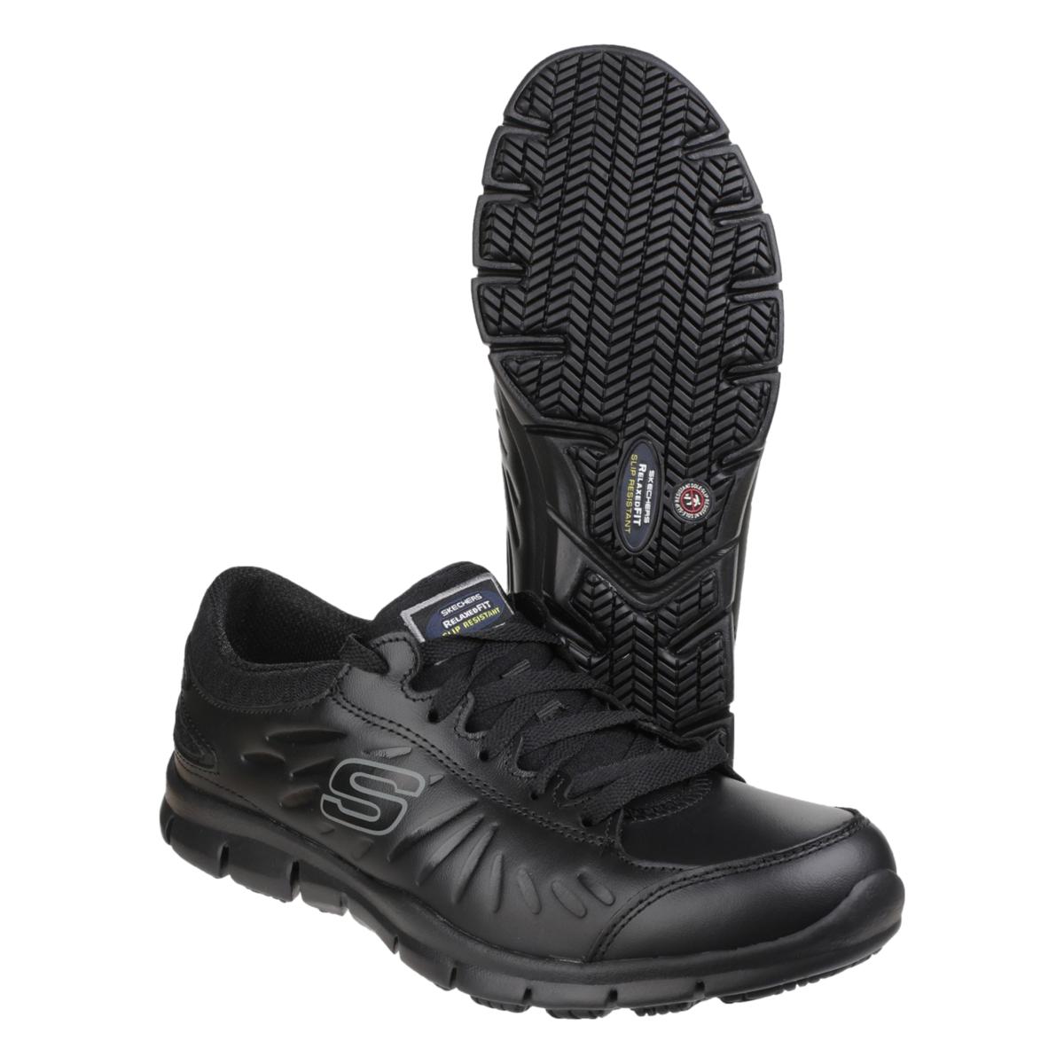 Sporty style meets surefooted comfort in the SKECHERS Work Relaxed Fit Eldred SR shoe. Smooth leather upper in a lace up sporty casual work slip resistant sneaker with stitching accents and Memory Foam insole.