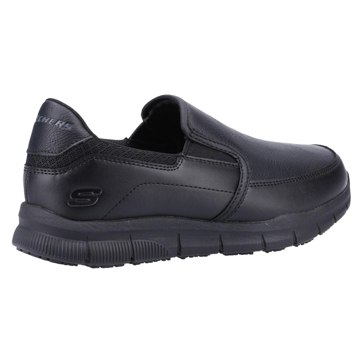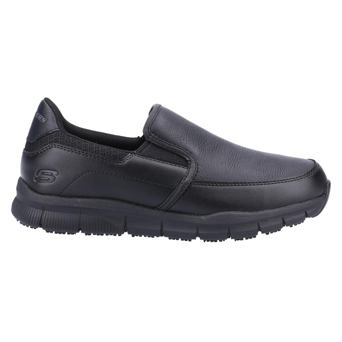 Have a comfortable and safe day every day with the SKECHERS Work Relaxed Fit: Nampa - Annod SR shoe. Smooth leather-textured synthetic upper in a slip on sporty casual comfort work slip resistant sneaker with stitching accents and Memory Foam insole.