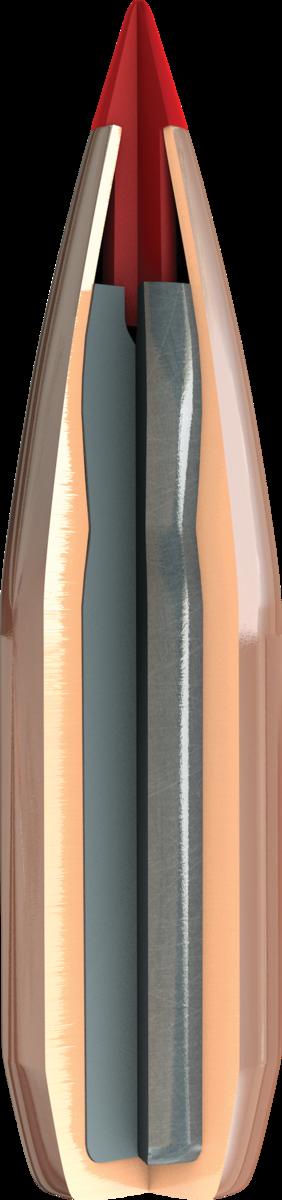 The Hornady® InterBond® bullet uses a proprietary bonding process that holds the core and jacket together. Unlike partitioned or dual-core bullets, where the front core can separate from the bullet mass, the InterBond® bullet holds together in a single destructive mass that delivers a deep, wide wound channel without over-penetrating.