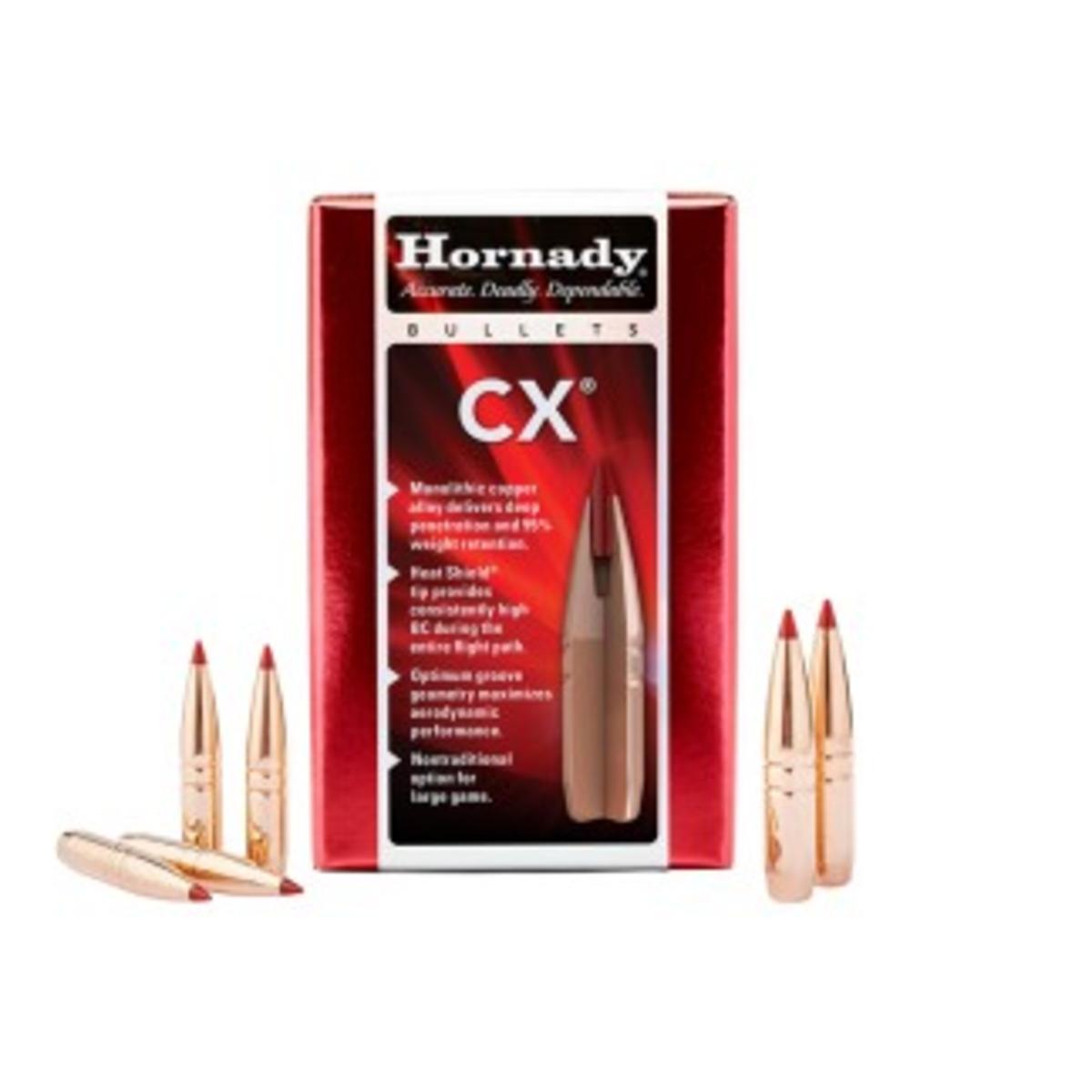 The CX™ (Copper alloy eXpanding) bullet from Hornady represents the most advanced monolithic hunting bullet on the market. Its optimized design offers extended range performance, greater accuracy, high weight retention, and deep penetration.