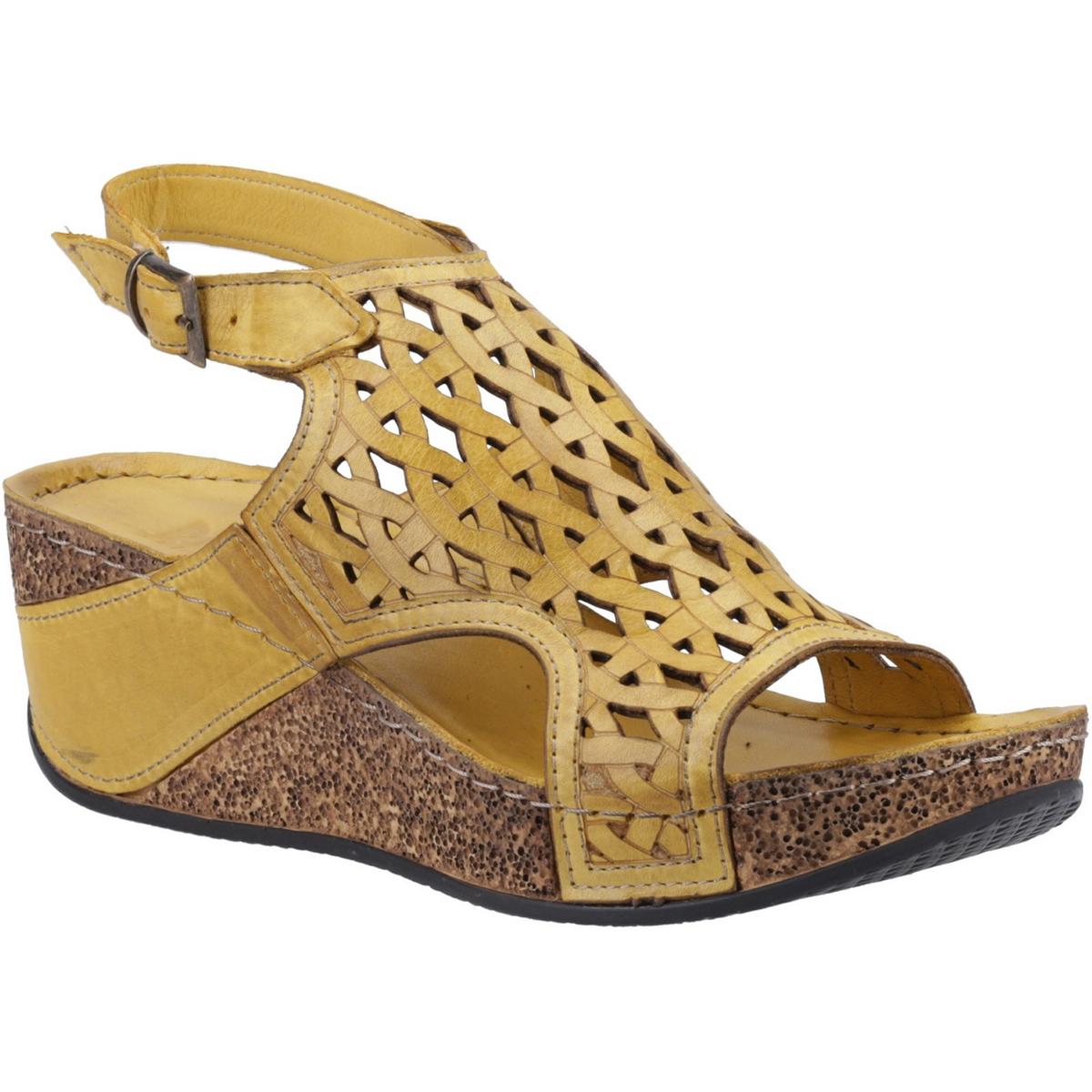 Ladies colourful wedge. Featuring leather cut out detailing. With a peep toe. Set upon a cork effect wedge heel.