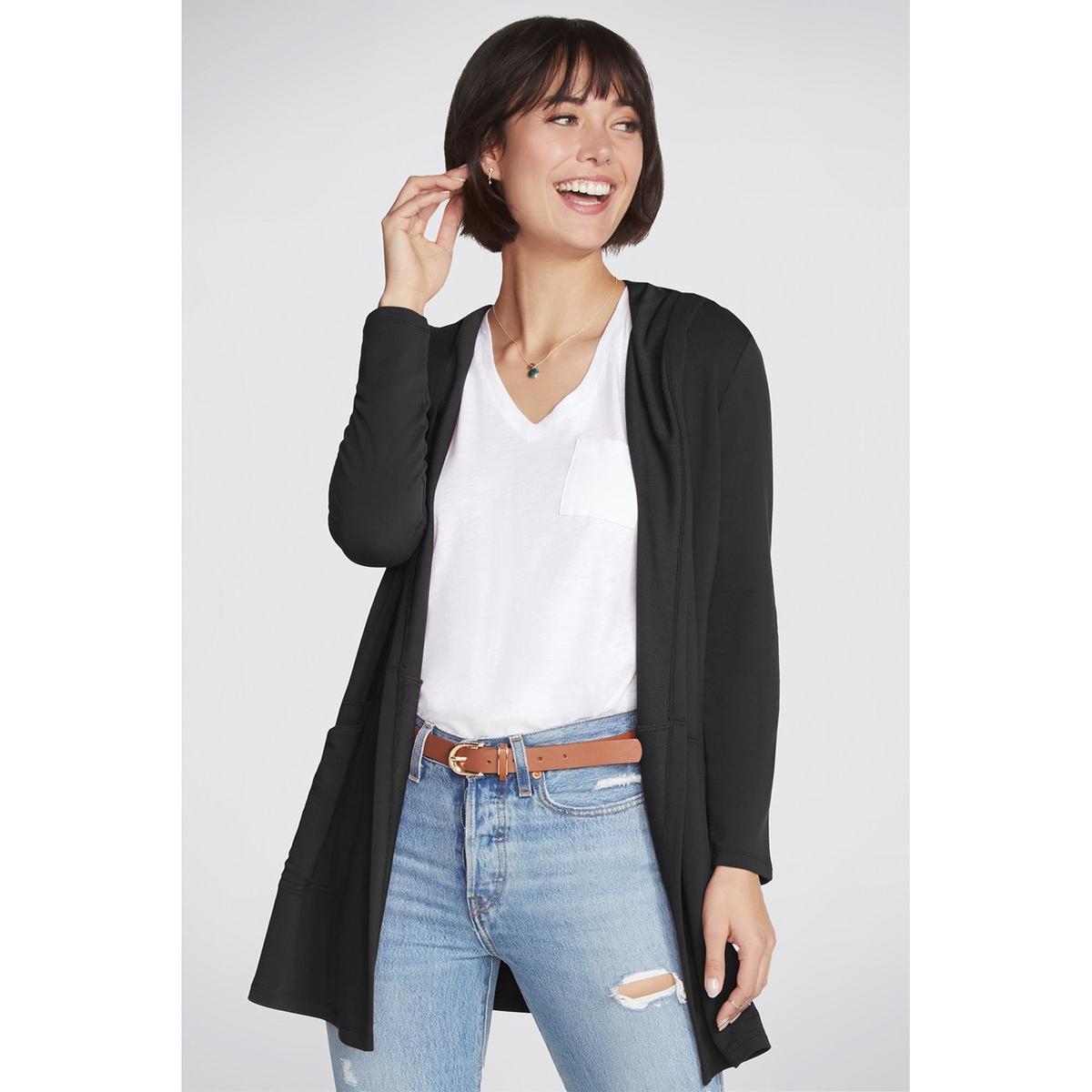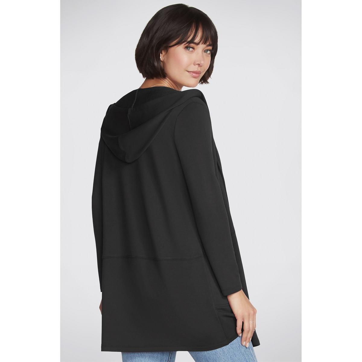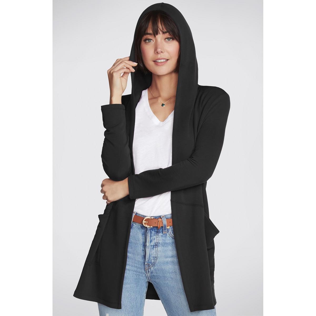 Wrap yourself in soft comfort and versatile style with the Skechers Apparel Restful Hoodigan. SKECHLUXE French Terry fabric in a hooded cardigan sporty wrap jacket with comfort features.