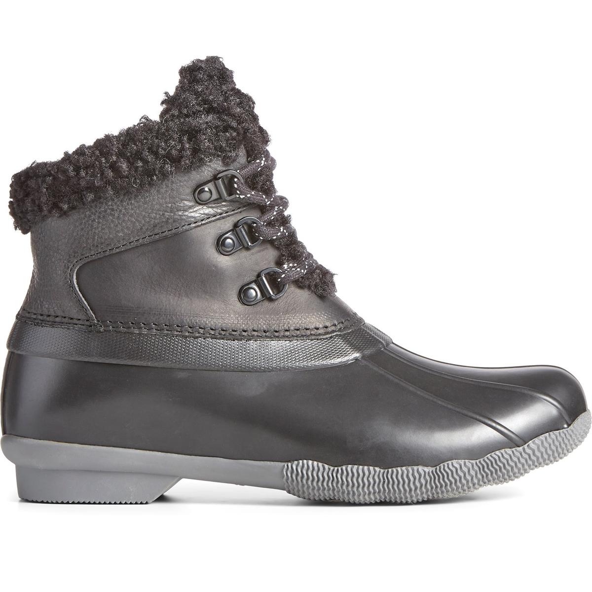 - Water-resistant leather shaft with faux fur trim and rubber duck shell