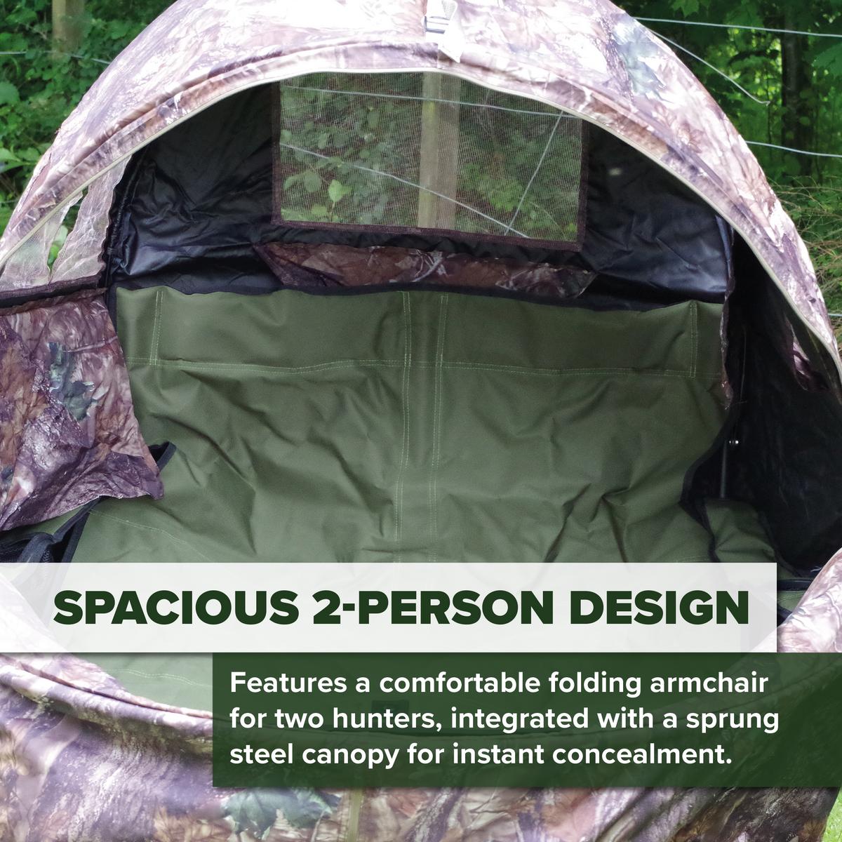 - Spacious 2-Person Design – Features a comfortable folding armchair for two hunters, integrated with a sprung steel canopy for instant concealment.