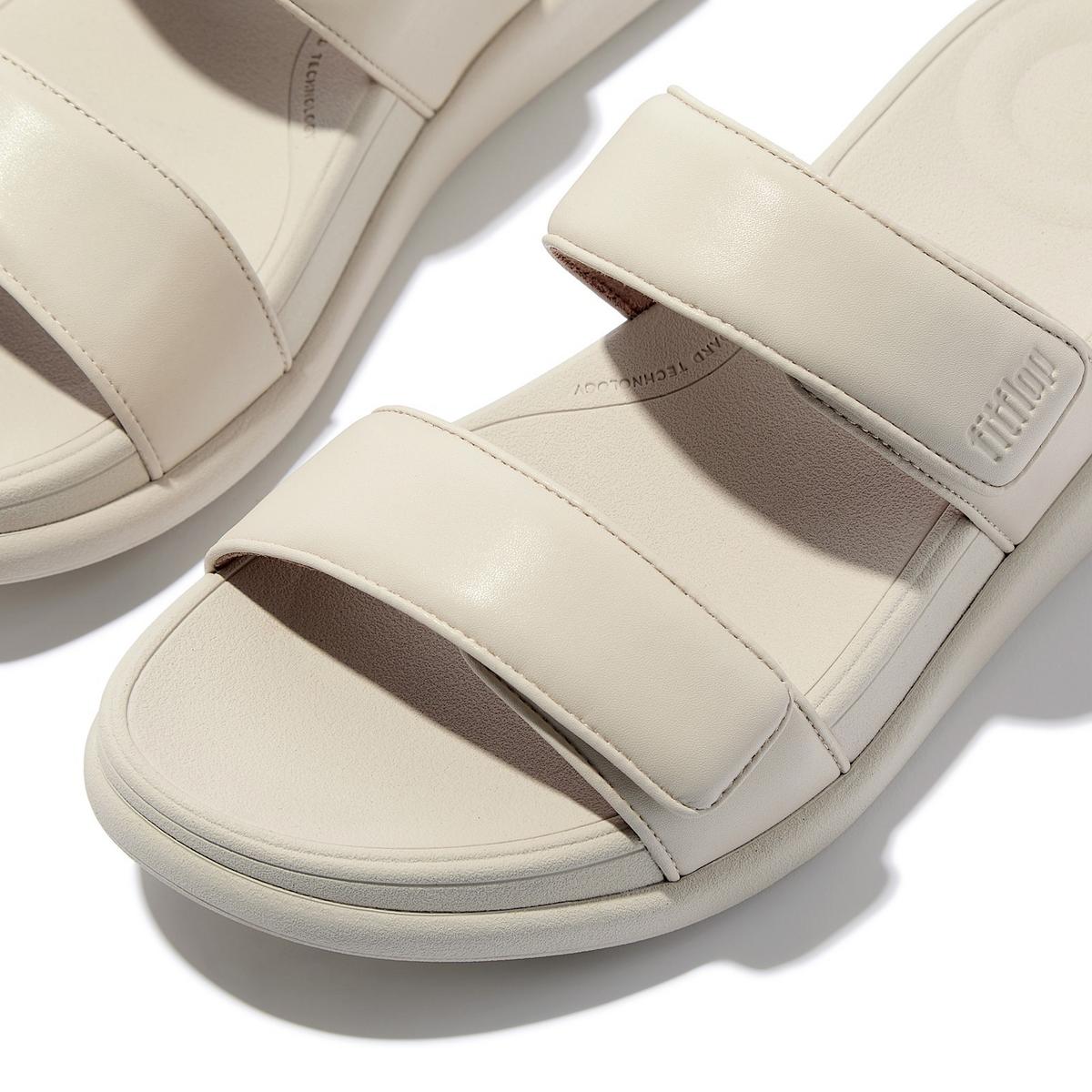 With our F-Mode Go weve created a simple streamlined sandal infused with our signature comfort. Chunky soled, featuring a modern stripped-back design and fluid lines. This two-bar slide in padded pillow-soft metallic faux-leather.