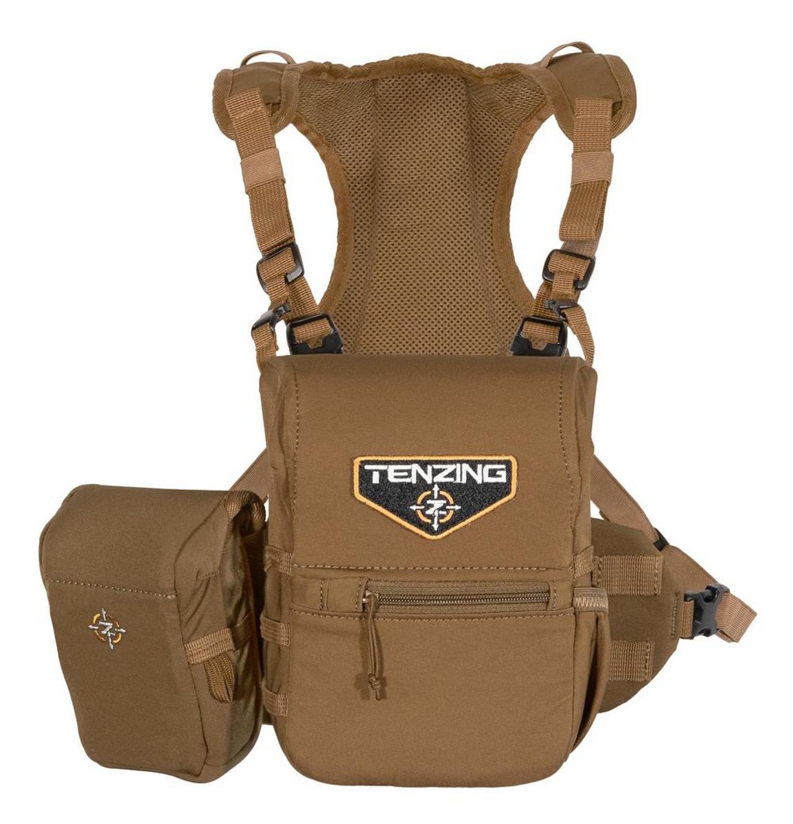 The Bino Harness is made from 300D Honeycomb Poly Oxford fabric, ensuring top-tier durability. It features an enclosed magnetic closure for secure access, batwing construction for easy attachment of accessories, and a rangefinder pocket with a tether. Elastic straps provide flexibility to stretch over extra layers without adjustments.