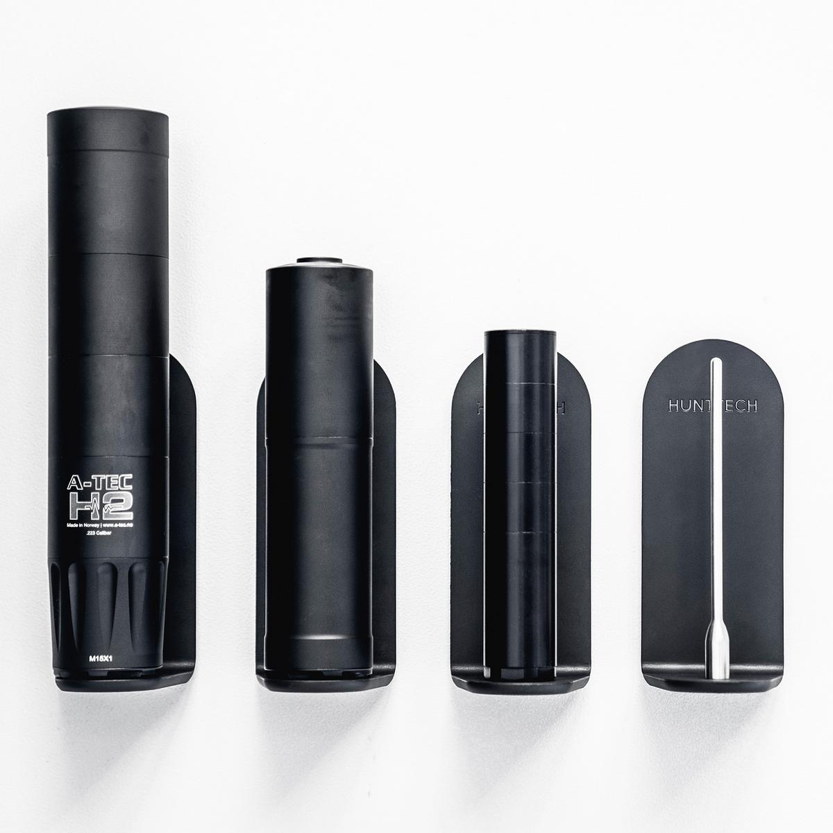 Aluminum bracket for storing silencers. Suitable for silencers up to a weight of 2 kg. It is attached by magnet in all types of gun cabinets.