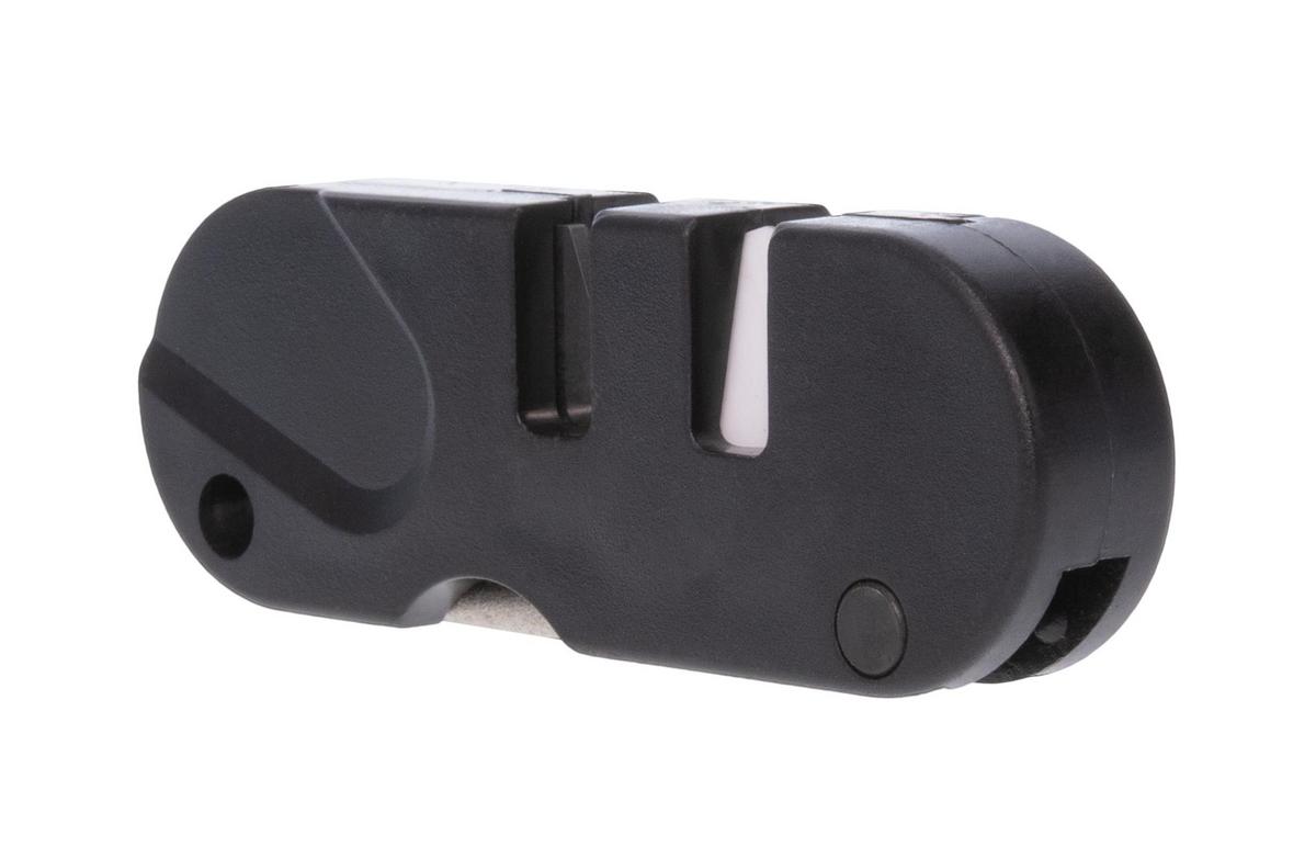 The 3-in-One Knife Sharpener has two pre-angled sharpening stones. One of the stones is ceramic and the other is carbide. The carbide edge can provide you with a quick sharp edge, and the ceramic sharpener can give you a finer, razor-sharp edge. Additionally, there is a fold out, diamond coated tapered rod for sharpening serrations or small gut hooks.