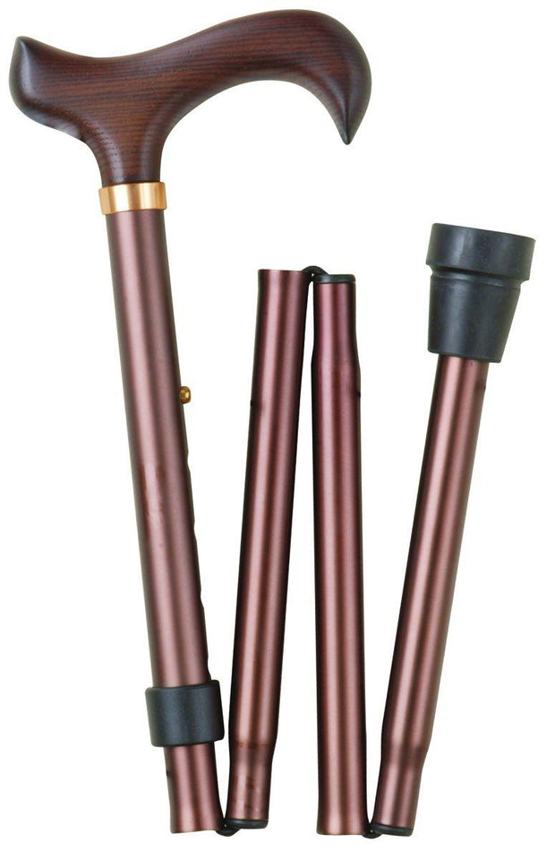 Deluxe Crutch Wood Handle, Bronze Stick Deluxe Folding are four section folding aluminium sticks with a natural wood derby style handle. They adjust in height from 32.5" to 37" using a simple popper mechanism. All come with fitted wrist cord and heavy duty ferrule.
