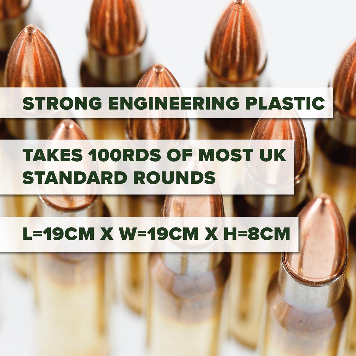 Keep your ammunition safe, organised, and easily accessible with the BushWear Deluxe 100 Round Ammo Box—a durable, high-capacity solution for storing and transporting your rifle rounds. Crafted from strong, engineering-grade plastic, this box is designed to withstand rough handling and frequent use in the field or at the shooting range.