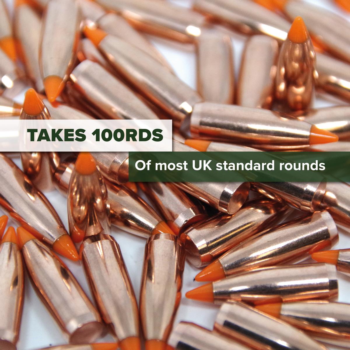 With capacity for 100 rounds, it’s perfectly suited for common calibres such as .220 Swift, .22-250 Remington, .243, .270, .308 and .224 Weatherby Magnum. The flip-top lid provides quick access while keeping your rounds protected from dust, dirt, and moisture.
