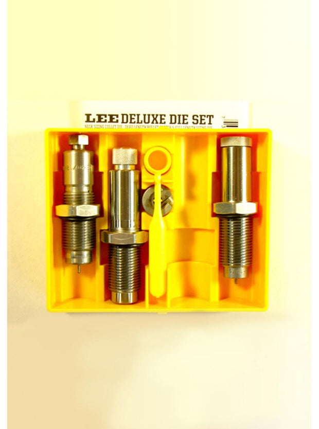 The Lee Deluxe Rifle 3-Die set is perfect for the beginning or experienced reloader. The set is made of steel and includes a full length sizing die, collet neck sizing die and bullet seating die. Use the full length sizing die to produce ammunition to factory-new specifications using cases fired in other guns. The collet neck sizing die will allow you to produce ammunition that is fire-formed to the chamber of one rifle. Shellholder, powder measure, storage box and load data included...
