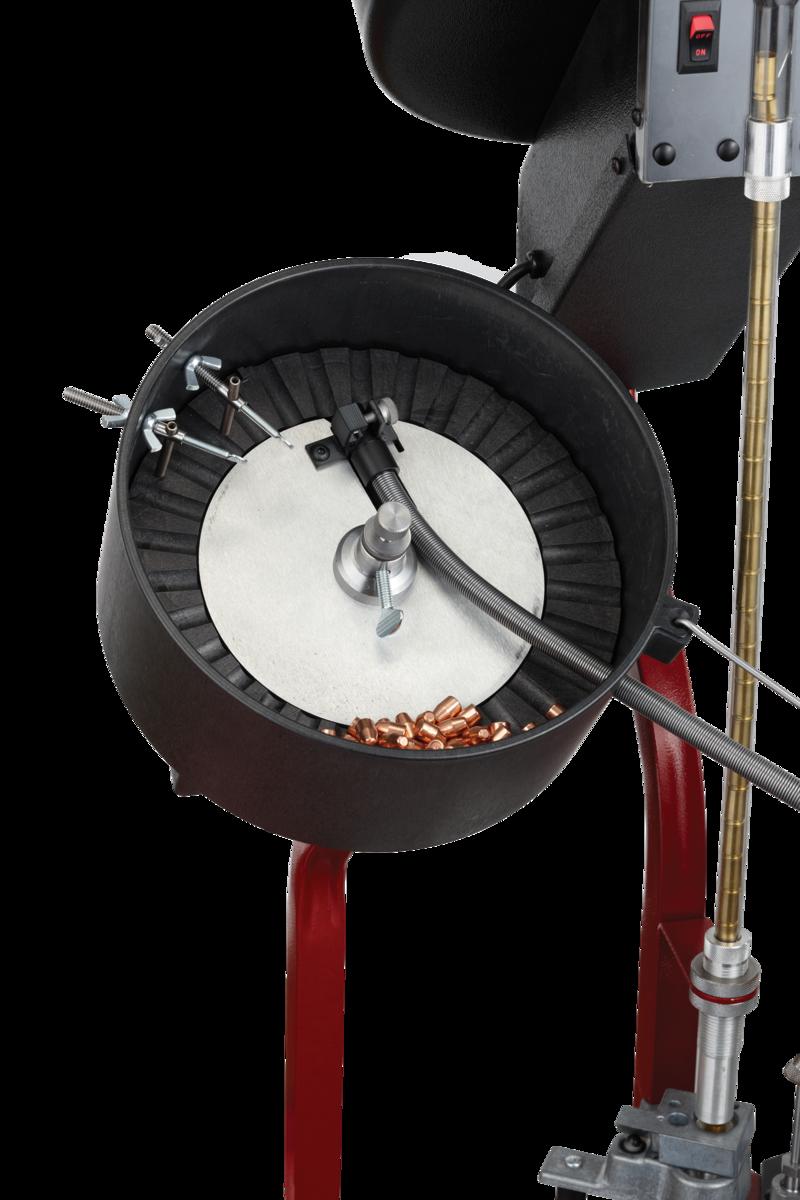 The easy-feed bullet hopper holds up to 200 pistol bullets and features an adjustable center plate and bullet feed wipers to ensure smooth feeding.