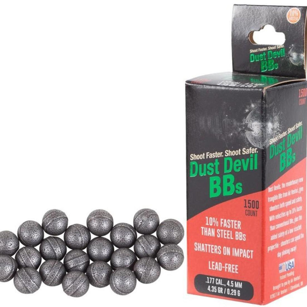 Dust Devil BBs are the world's first frangible BBs in .177 / 4.5 mm BB. They shatter on hard surfaces on impact, minimizing the risk of ricochets for which steel BBs are known. Dust Devils are lighter and faster than steel BBs, lead free and usable in magnet-operated magazines.