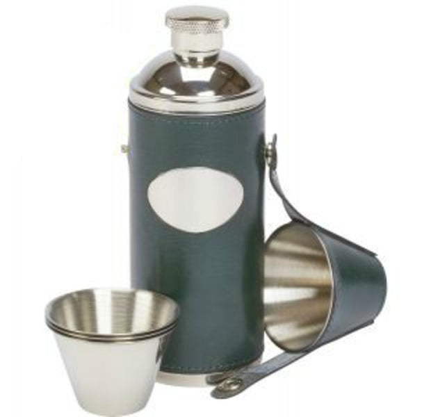 8oz Stainless steel flask with green leather cover. Includes a set of four 1oz stainless steel cups with leather case that all attached together in one neat unit.