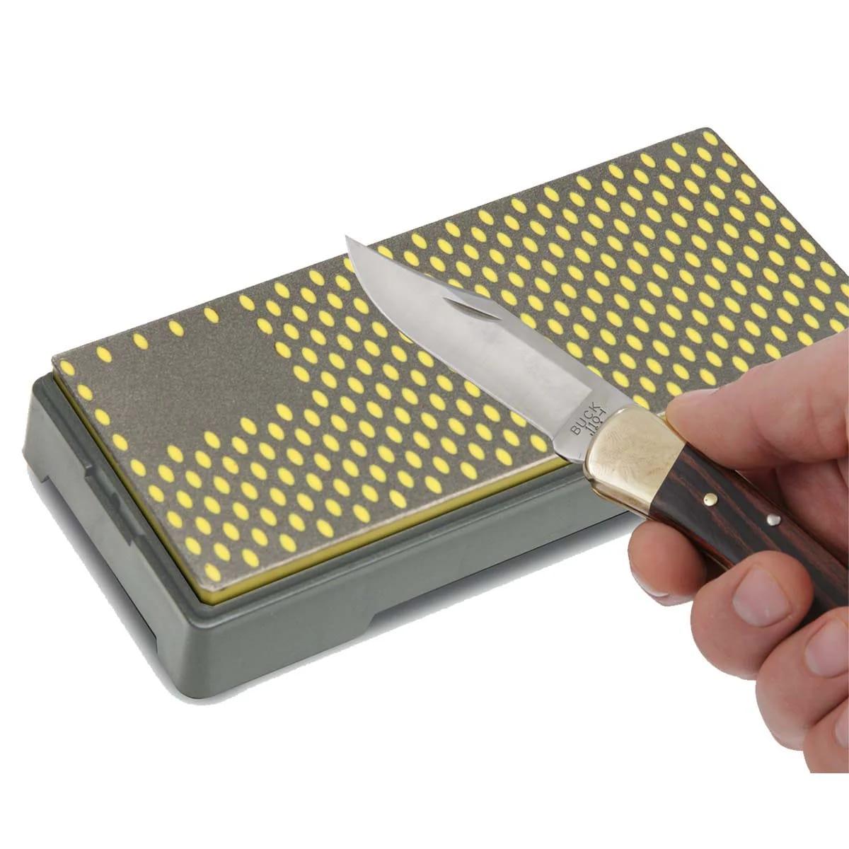 Smith's 6" x 2.5" Diamond Bench Stone-Coarse features multiple layers of micron-sized moncrystalline diamonds bonded in nickel to a flat metal surface. The unique overlapping oval hole design speeds sharpening by collecting and holding the metal filings which ordinarily build up during the sharpening process. This allows the sharpening surface to remain clean and clear and speeds sharpening. This stone is excellent for sharpening side woodworking tools, medium to small sport/utility knives, or kitchen knives.