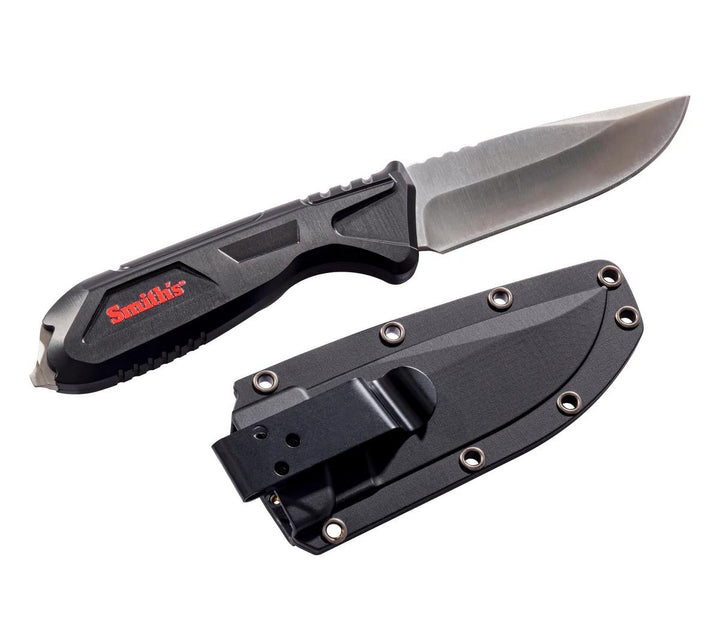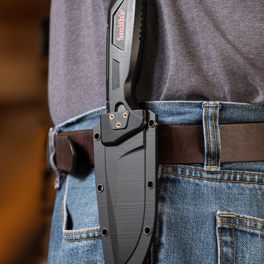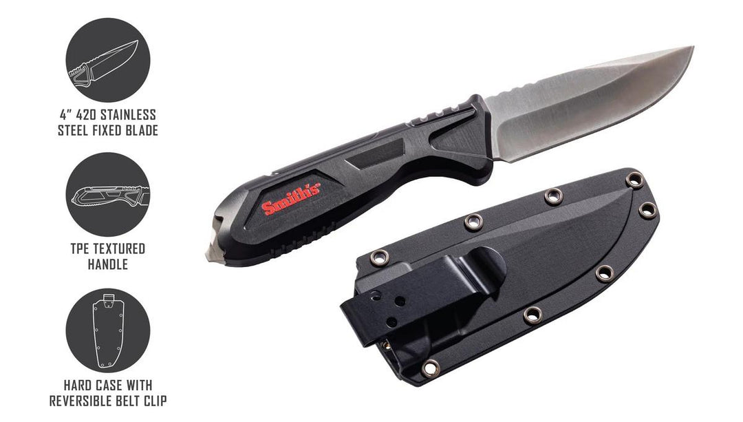 Smith's EdgeWork-Site 4.0" fixed blade features a black stonewash finish that provides extra protection while providing a rugged look. The razor-sharp fixed blade is made of precision heat treated 400 series stainless steel blade. The fixed blade knife is equipped with a glass-filled textured handle and hard sheath with an ambidextrous belt clip.