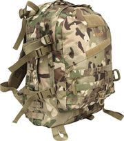 This heavy duty 45 litres rucksack features 3 zipped compartments (front, middle and main) with sturdy 2-way zippers. Additionally the main compartment goes with an internal pocket for a hydro pack and the front pocket has diagonal zipper for easy access. On the top of the rucksack there is strong carrying handle and one passage to the main compartment for a drinking tube or earphones (covered with thick nylon patch). Furthermore the bag has two Velcro patches on the front.